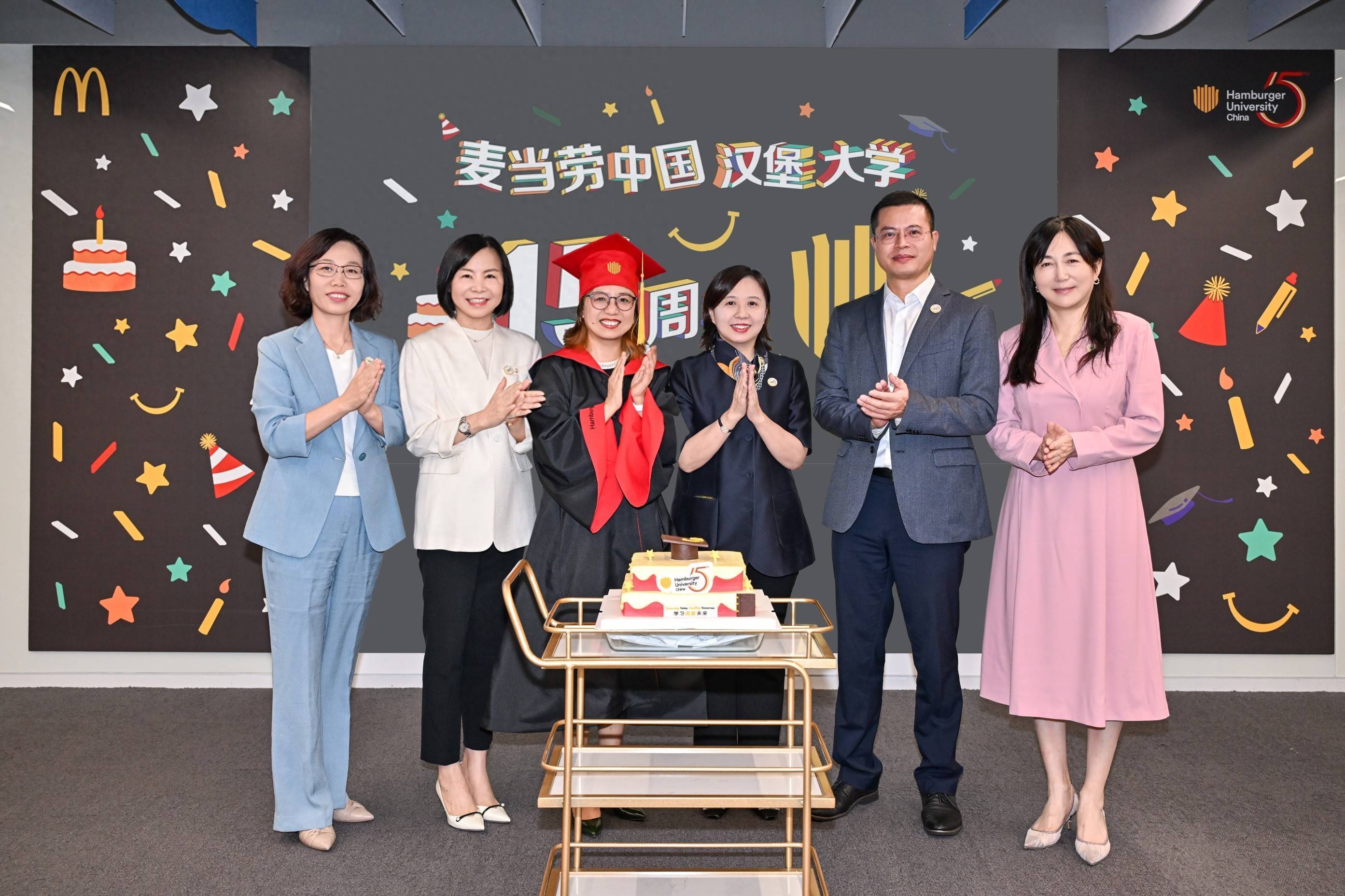 中国连锁经营协会会长彭建真(右二),麦当劳中国首席执行官张家茵(右三),麦当劳中国首席运营官林慧蓉(左二),麦当劳中国首席人力资源官王艳伟(左一),麦当劳中国首席影响官顾磊(右一),麦当劳中国汉堡大学校长李娟娟(左三)共同参与麦当劳中国汉堡大学十五周年庆典仪式。
