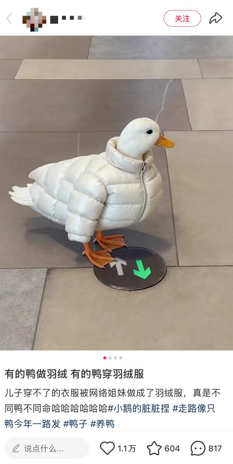 “这件陪我度过第一个工作冬天的羽绒衣,现在要陪柯尔鸭度过一个温暖的冬天了。”杭州网友发现鼎豪投资,自己的闲置羽绒衣,下一站来到了一位养柯尔鸭宠物的主人手中。经过巧手一改,羽绒衣成了降温天气里的宠物“羽绒小窝”。也有网友给宠物鸭穿上了“羽绒衣”,评论区充满了羡慕之情,“真是不同鸭不同命啊!”