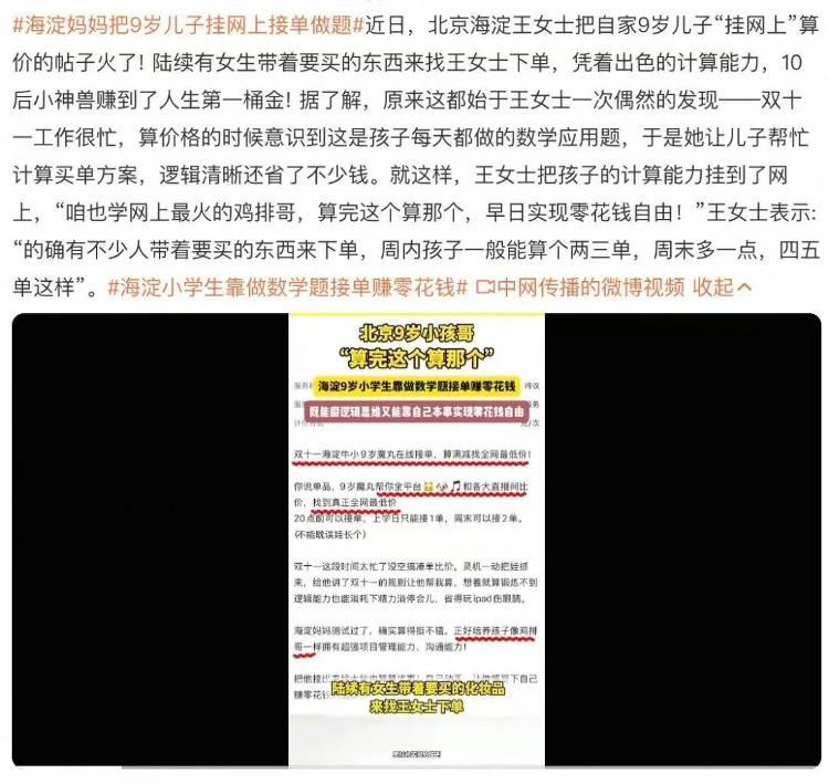 “攻略完这个攻略那个,”这个双11,北京海淀王女士把9岁儿子“挂网上”接单做双11购物攻略的帖子火了。