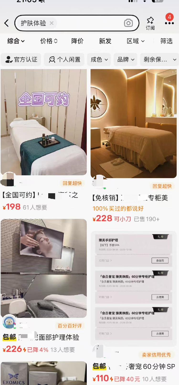 想试一试高奢品牌专柜护理的网友真真,近期在闲鱼找到了不少“闲置中”高奢美容房护理券,价格在一两百元/次。真真说,常去专柜的网友都知道,一些护肤品大牌必须要累计消费到数万元甚至更高级别,才有机会获得一次美容房服务,“但是,在闲鱼上,人人有机会,用更少的钱解锁同款服务。”
